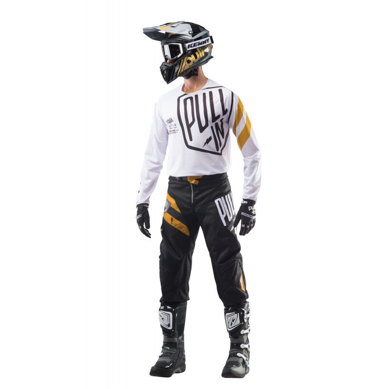 Maillot cross Pull In Challenger blanc noir gold en matière aéré : 100% Polyester respirant. Coupe ajustée. Manches coupe raglan. Col extensible facilitant le port d’une protection cervicale. Finition stretch aux poignets.